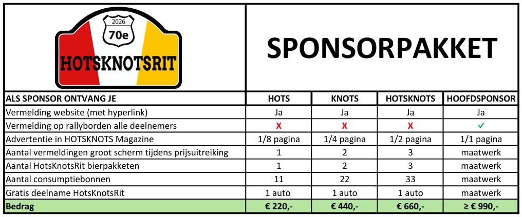 Naast aandacht van meer dan 300 trouwe HotsKnotsRijders krijg je er vooral zelf een hartstikke goed gevoel bij. Na afloop dan ook nog thuis nagenieten van een glas HotsKnotsBier. Wat wil je nog meer! Dat je daarbij de HotsKnotsRit nog mooier hebt gemaakt is mooi meegenomen! En je kunt al je relaties melden dat je sponsor bent / was van de legendarische HotsKnotsRit (sinds 1954). Dat alles realiserend is de sponsorbijdrage zelfs aan de lage kant. (Niet doorvertellen anders verhogen ze de bijdrage!)
