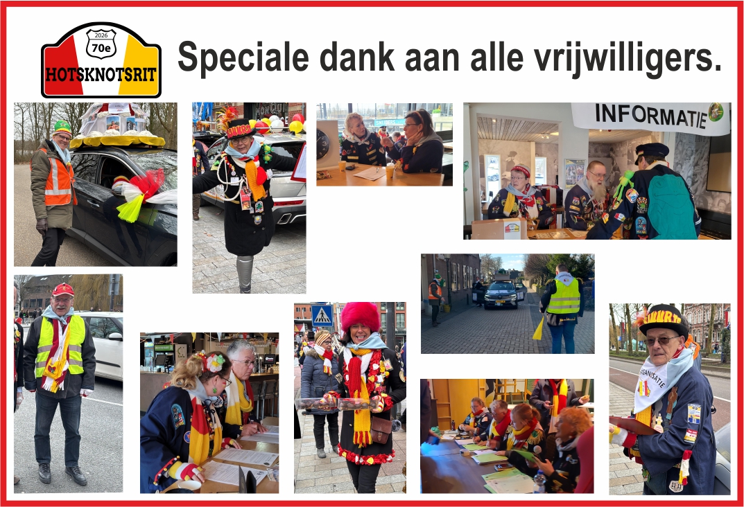 Ook dit jaar hebben weer vele vrijwilligers het mogelijk gemaakt, dat ruim 400 deelnemers in 121 equipes hebben kunnen genieten van een mooie carnavalszaterdag. Naast de zichtbare vrijwilligers, natuurlijk ook speciale dank aan de rit-uitzetters, rekenkamer en sponsorcommissie.